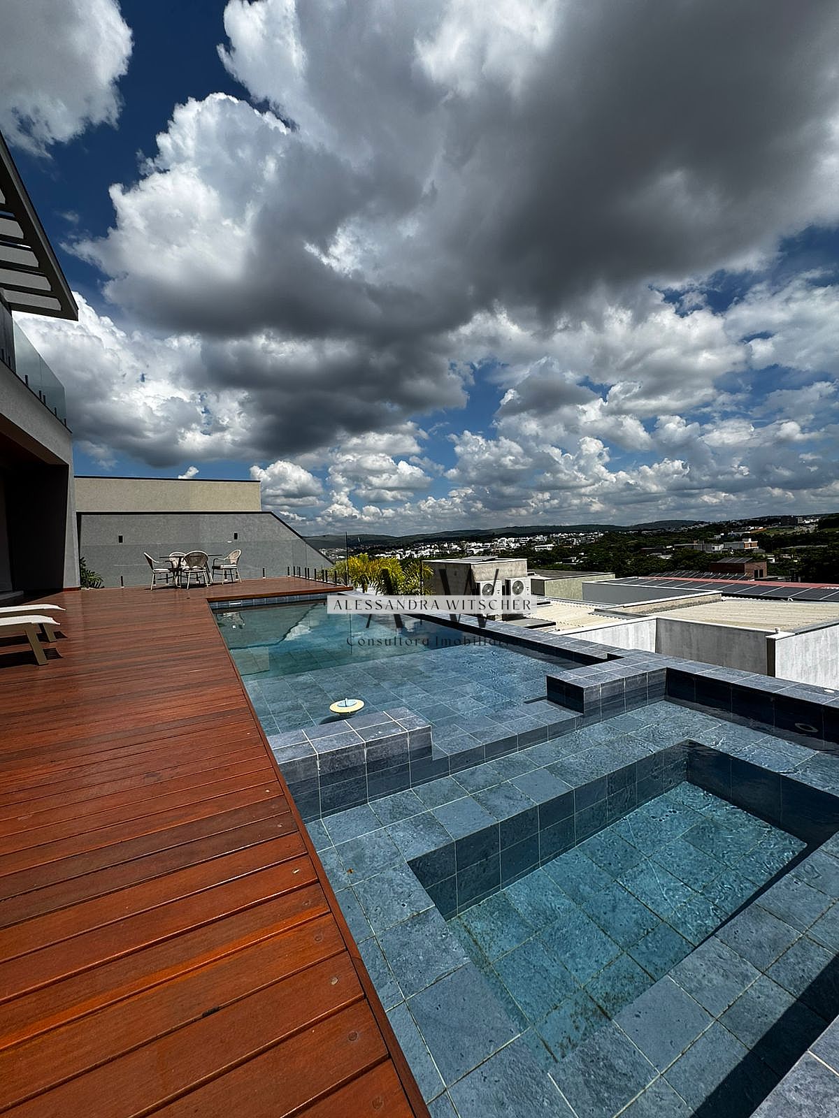 • Piscina com borda infinita, SPA e deck em madeira Cumaru